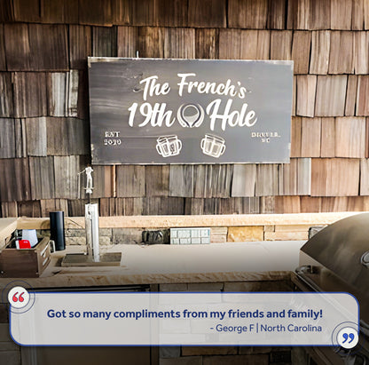 Love our custom sign! We installed a golf simulator in our lower level and got a “19th hole” sign to welcome guests. Had our first party tonight and everyone raved about the “super cool sign.”