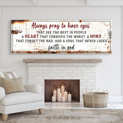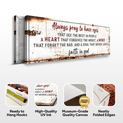 Always pray to have eyes that see the best in people, a heart that forgives the worst, a mind that forgets the bad, and a soul that never loses faith in God. The Always Pray To Have Eyes sign is more than just art, it's a reminder to stop and think about what you're praying for. What do you want your eyes to see? What do you want your heart to feel?