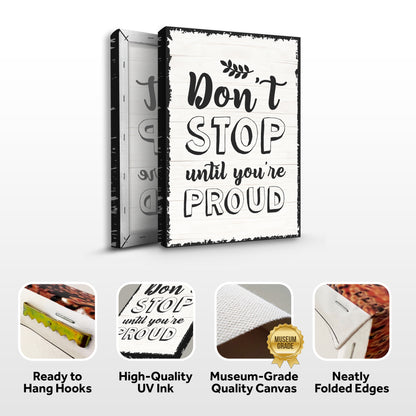 It serves as a visual reminder to you and the individuals you share your space with that grit, focus, and optimism are values that should be valued. "Don't Stop Until You're Proud" wall art is a motivational statement that can benefit any room. The inspirational Don't Stop Until You're Proud sign is vibrant and beautiful enough to fit in any stylish home. No matter what obstacles you encounter, never give up until you're proud! This Don't Stop Until You're Proud canvas wall art may serve as a source of motivation and pride in your house.