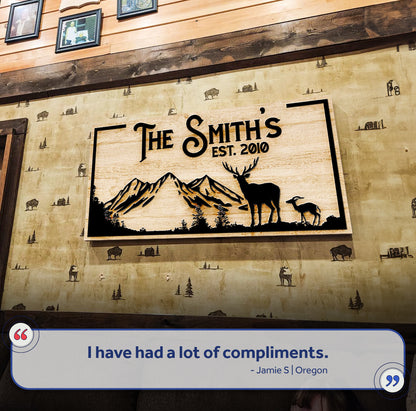 Take your home decor to the next level with this stylish customizable mountain-themed family sign.
