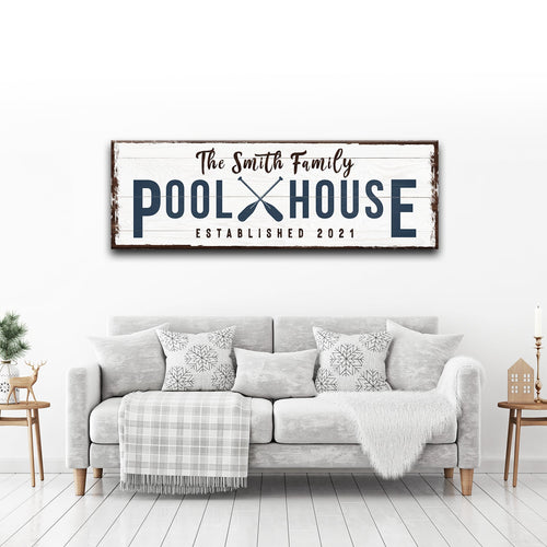 A pool house is perfect for relaxing and enjoying time with family and friends. But why settle for a dull, cookie-cutter pool house when you can have a stylish and unique one? Family Pool House Sign print offers various options to make your pool house your own. Choose from three sizes, each with a different background color. Then add your Family name, custom text, and even an optional photograph. Family Pool House Sign wall art will help you create a pool house that's uniquely yours - and sure to envy your neighborhood. So get creative and make your Family Pool House canvas wall art today!