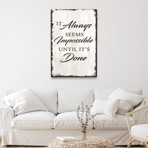 An It Always Seems Impossible Until It's Done Sign can do wonders for your space. It can help you get things done, it can help you feel empowered, and it can remind you that anything is possible. If you have any hesitation or self-doubt about a project or goal, this sign will help you overcome those feelings and get to work.
