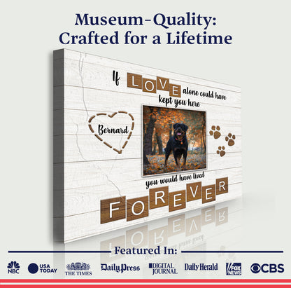 Let the memory of your beloved family member live on with this custom dog memorial pet loss frame portrait. Take comfort in the elegant wood patterns that will complement any photo canvas for any home décor style. Hang this passing gift in your pet's favorite room as a fitting tribute to the happy memories that you once shared.