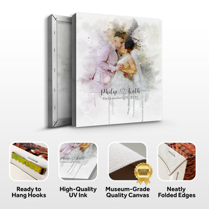 With this Custom Wedding Portrait Watercolor canvas wall art, you can take your favorite wedding photo to a whole new level of creativity. For newlyweds who need something to show in their new love nest, this wall painting is the ideal present!